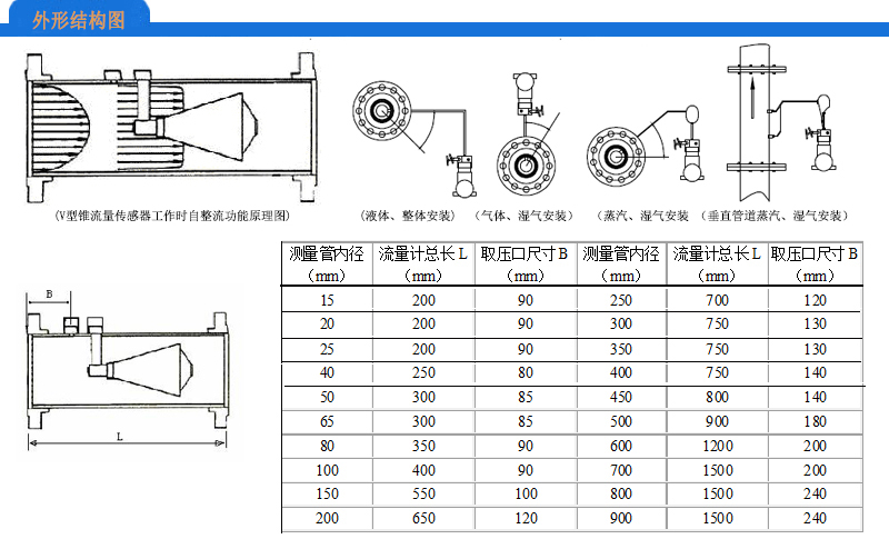 V錐流量計又稱為V型錐流量計,或者V錐型流量計,其關鍵部件即節流件為獨特的V型圓錐體,與其它差壓式流量計相比,克服了其他節流裝置的缺點。雖然測量原理與其它差壓式儀表相似,但幾何結構卻不同,懸掛在管線中心的V型錐體具有獨特的"整流"功能。流體在節流元件的作用下,流場將經過"非穩定流→穩定流→恒(常)流"的變化過程,在節流元件的上游部分達到差壓式流量計測量原理所需要的理想前提條件,從而本質上保證了測量的精度。