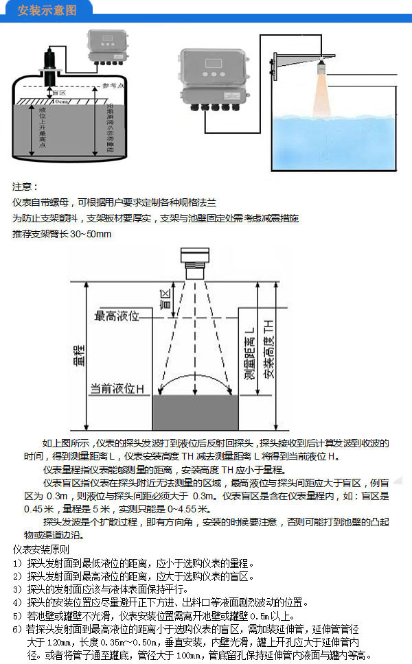分體式超聲波液位計由傳感器(換能器)發出超聲波脈沖,聲波經液體表面反射后被同一傳感器接收或超聲波接收器,通過壓電晶體轉換成電信號,根據聲波的傳播時間與聲波發出到物體表面的距離成正比,并由聲波的發射和接收之間的時間來計算傳感器到被測液體(固體)表面的距離。廣泛用于河道、水池以及化工物料容器的液位測量與控制。